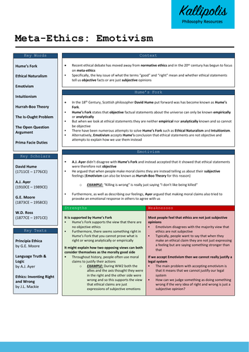 Meta Ethics Emotivism Knowledge Organiser Teaching Resources